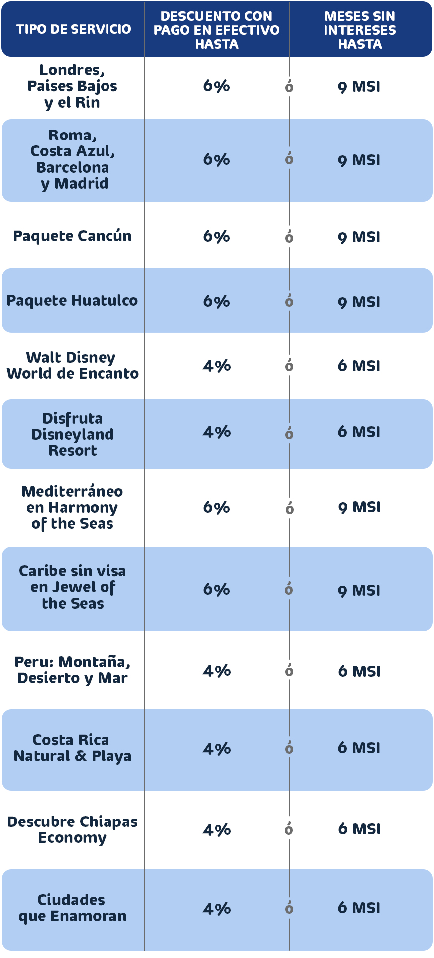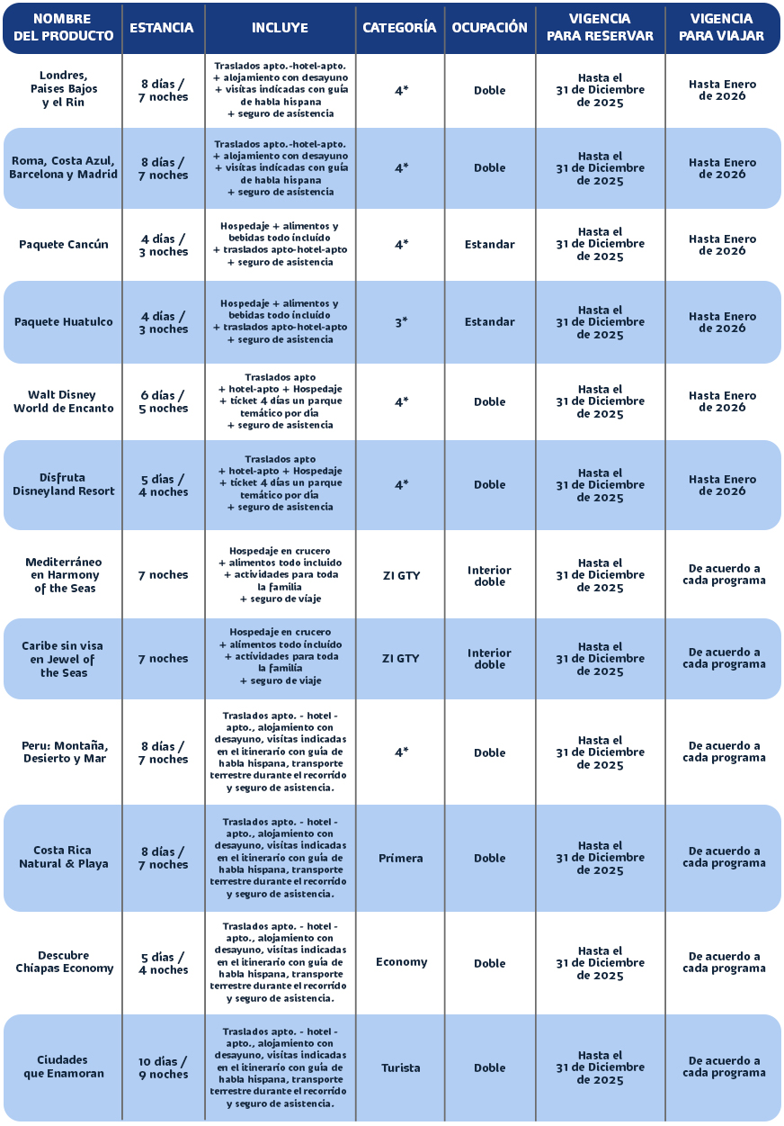 • Consulta otras promociones de productos participantes con asesor de viaje. Aplica solo vía Contactcenter y Whatsapp. Consultar Bancos y Tarjetas participantes.