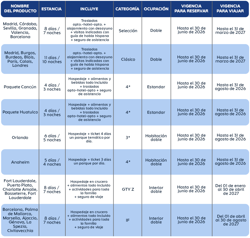 •La vigencia para viajar de paquete Huatulco, paquete Cancún, Orlando y Anaheim será hasta el 31 de agosto de 2026.