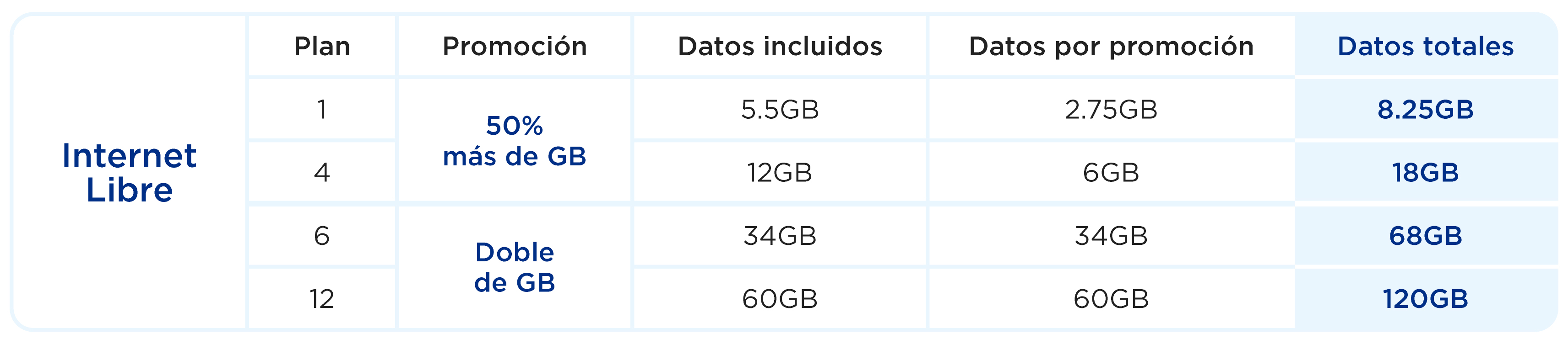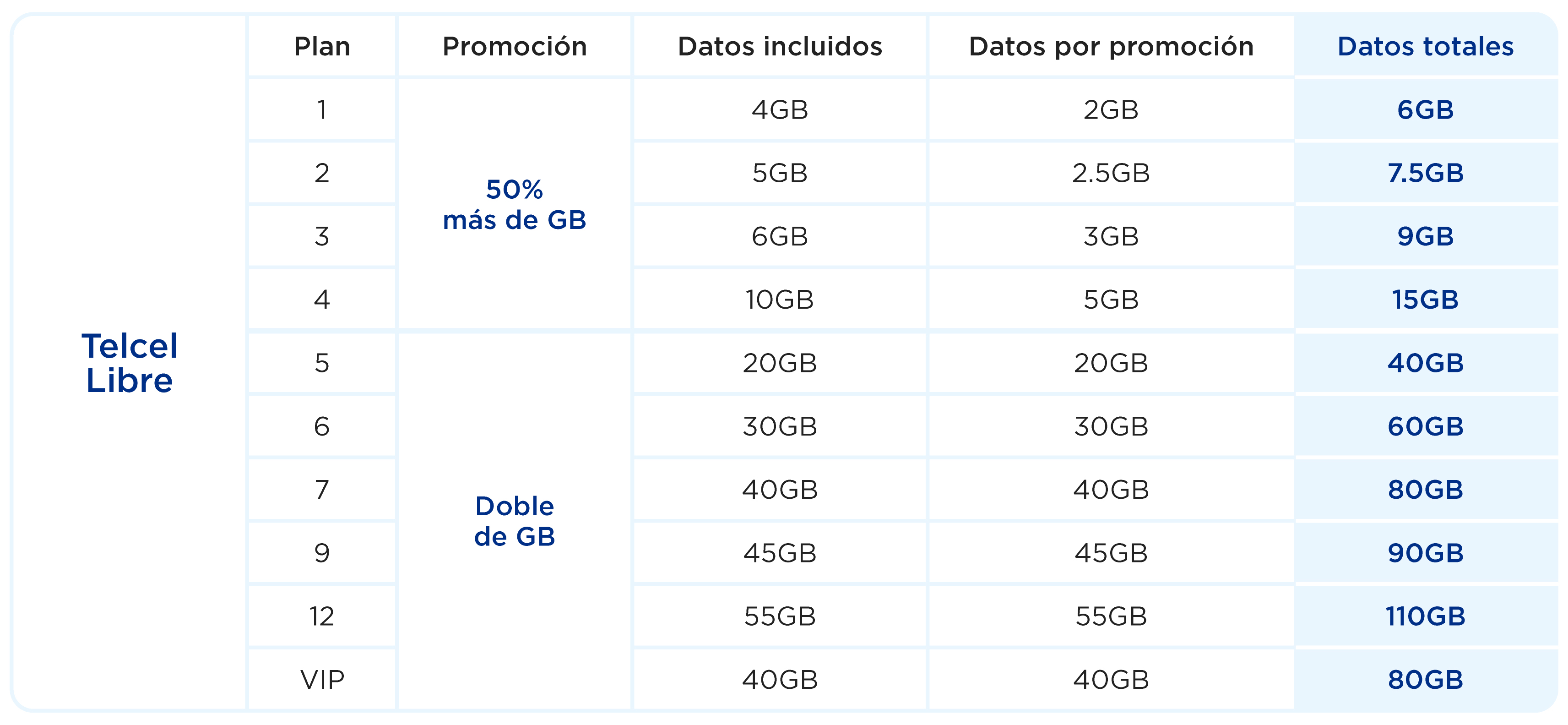 • Planes Telcel Libre 5 o mayor e Internet Libre 6 y 12: Una cantidad de datos adicional igual a la cantidad de datos para navegación libre incluidos en el plan contratado.